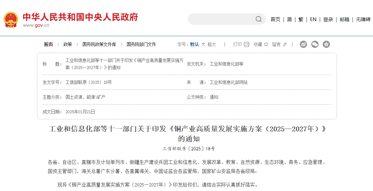 工业和信息化部等十一部门关于印发《铜产业高质量发展实施方案(2025—2027年)》的通知工信部联原〔2025〕18号各省、自治区、直辖市及计划单列市、新疆生产建设兵团工业和信息化、发展改革、教育、自然资源、生态环境、商务、应急管理、国资主...