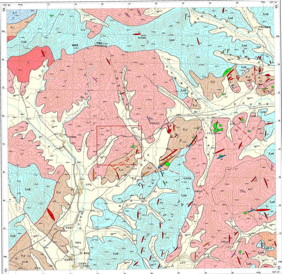 矿区位处黄岗 — 甘珠尔庙复式背斜北东端,属黄冈梁 — 甘珠尔庙成矿带,褶皱、断裂发育,岩浆活动频繁,成矿条件优越。矿区出露地层主要为二叠系中统大石寨组色安山岩、侏罗系上统满克头鄂博组流纹质晶屑凝灰岩;岩浆岩为燕山晚期钾长花岗岩;构造以断裂构造为主,按走向分北东向、北西向、近南北向,其中北北西向构造与成矿关系密切。